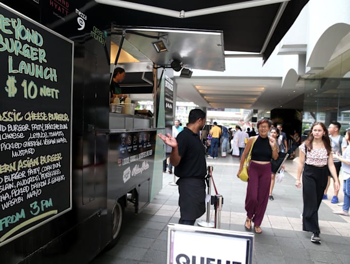 Restaurant mezza9’s now-defunct food truck, located outside the Grand Hyatt Singapore in 2018, which served the Classic Cheese Burger and the Modern Asian Burger using Beyond Burger plant-based patties. (Photo: CNA file photo)